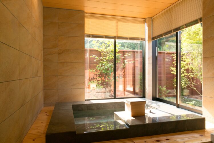 また、天然温泉を使用した半露天風呂も備わっていて、滞在中いつでも好きなだけ温泉を満喫できるのもポイント。