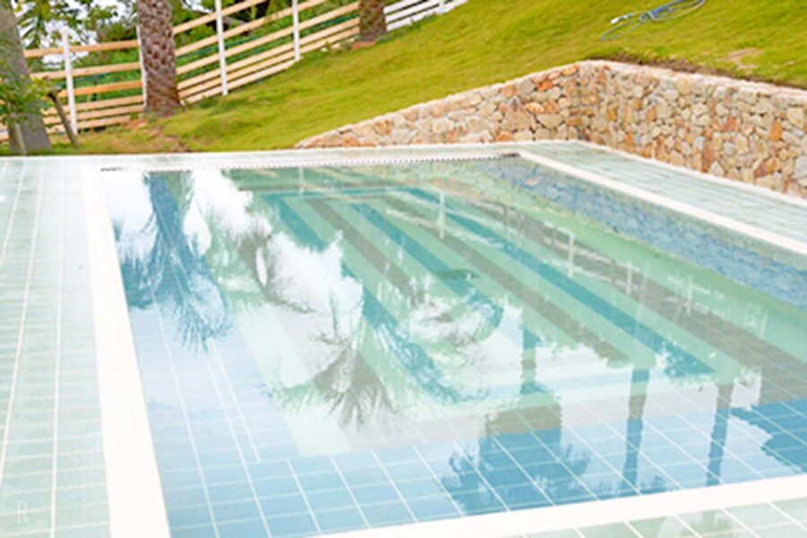 塩素を使わずほぼ毎日水換えをして手入れをしているプール、傾斜をつけて入水しやすくしてあり、プールデビューやシニア犬のリハビリでも安心なのだそう◎