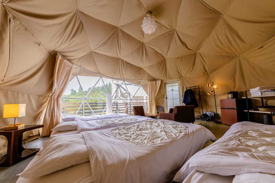 1日2組限定で温泉とグランピングが楽しめる温泉グランピング施設で、ドームテントでの宿泊を小型〜中型の愛犬と一緒に体験できます。