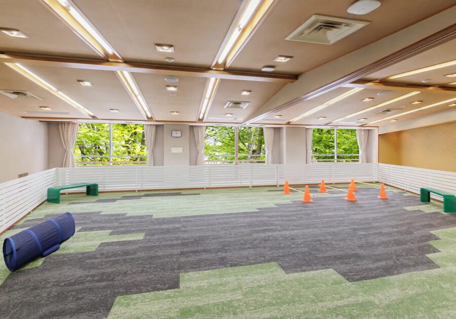 また、ウッドチップを敷き詰めた屋外ドッグラン(122㎡)に加え、雨の日でも走り回ったり他のわんちゃんと交流ができる室内ドッグラン(65㎡)も完備で、わんちゃんのストレス発散や気分転換にもぴったりです。