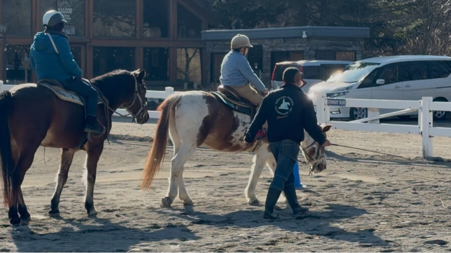 まずは馬場まで手綱を持って連れていき、背中に乗って、レクチャー開始。