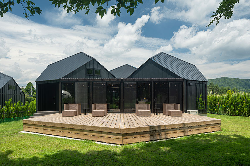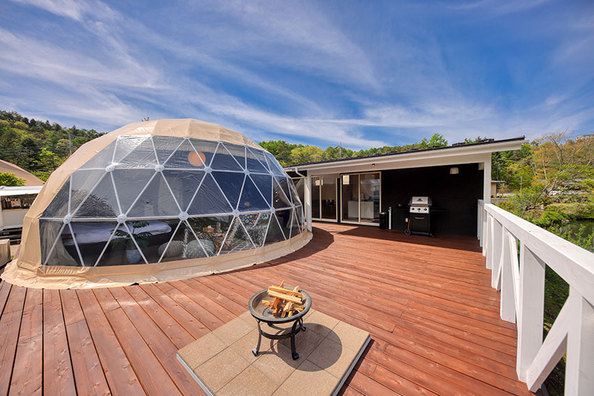 3棟のオリジナルドームテントと4棟のプライベートヴィラタイプの宿泊棟を有するプライベートヴィラグランピング富士山中湖。