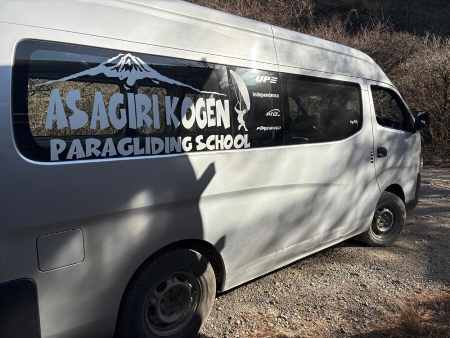 送迎車には初心者のわたしたちとパイロットさん以外にも、個人でパラグライダーをしに訪れているフライヤーさんたちが一緒に乗り込んで満員状態。