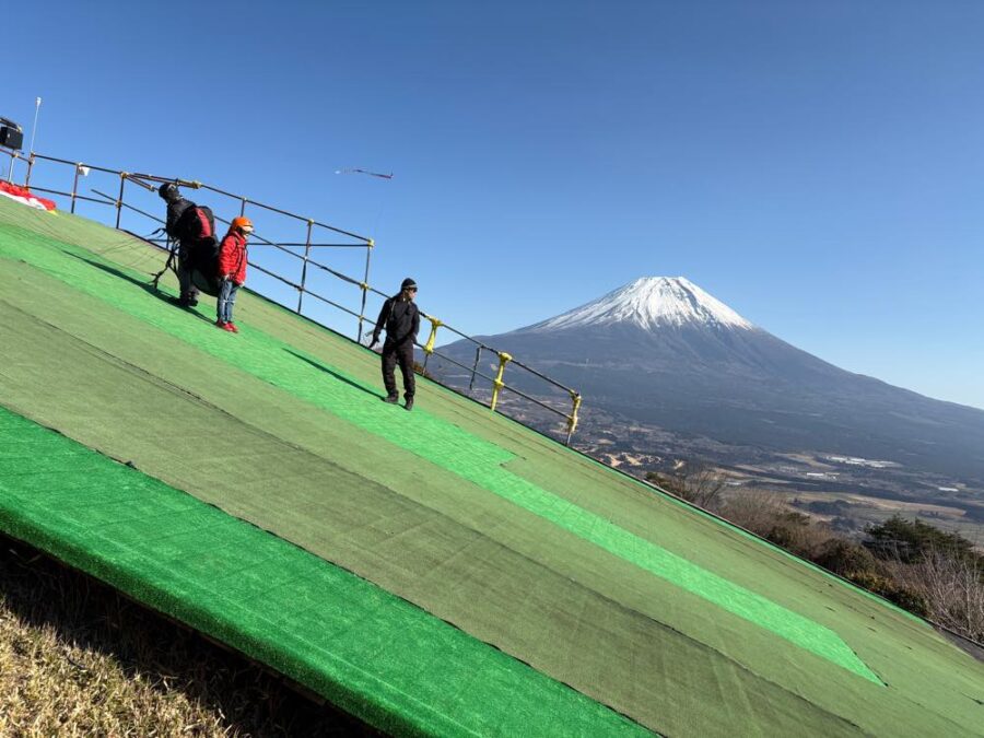 撮影のために離陸台の横へ行くと、同じ高さに富士山が見え、思った以上に傾斜があることがわかります。