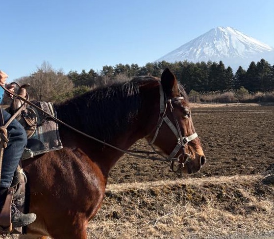 優しい目に癒される!|富士山を望む山道を乗馬でお散歩体験