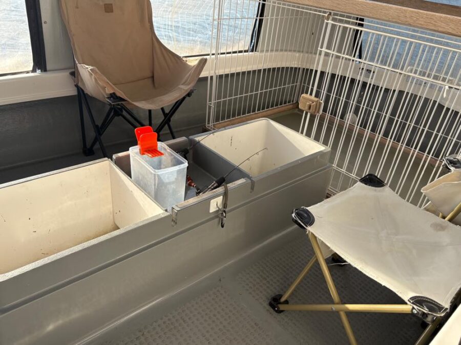 ミニドーム船内には、中型犬くらいまで入れそうなサークルと、釣り道具スペース、チェア、フリードリンクセットが置かれていて、プライベート空間でワカサギ釣りが楽しめるのも特別感があります。