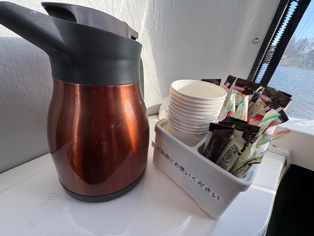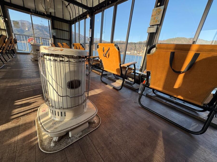 整然と並んだチェアの横には石油ストーブも置いてあり、船内はとても暖かで快適でした。
