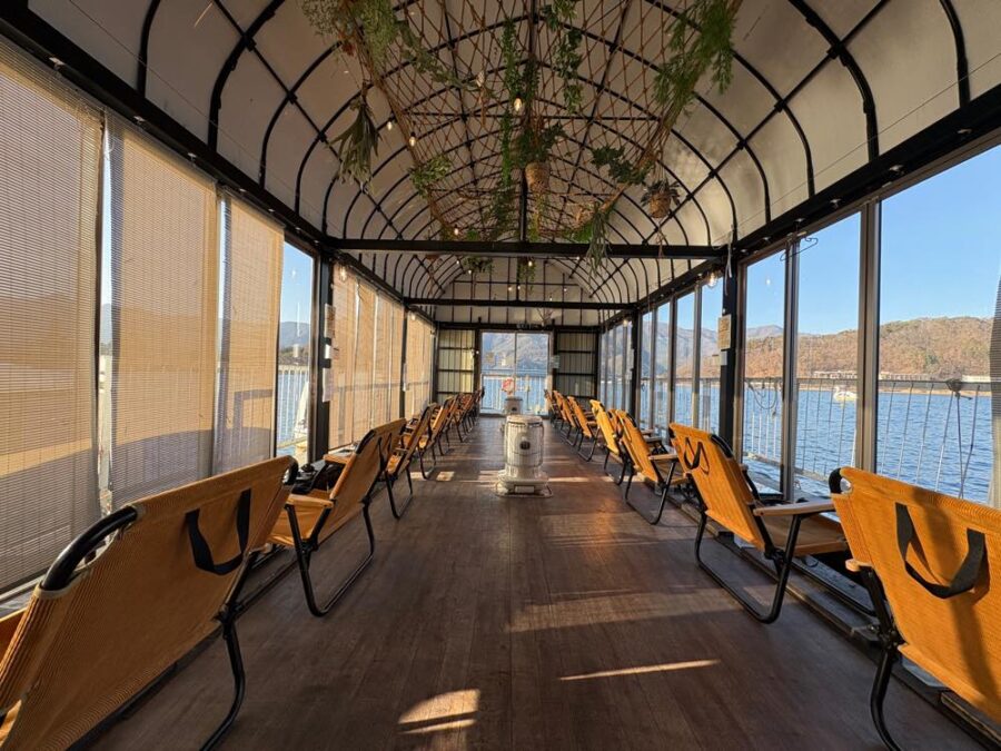 全面ガラス張りなので室内も明るく、河口湖との一体感も感じられそうな空間。