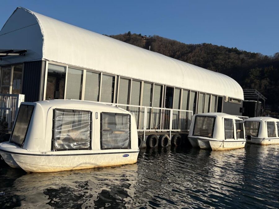 このドーム船、横に係留してあるミニドーム船では、犬も一緒にワカサギ釣りを楽しめるのも特徴。