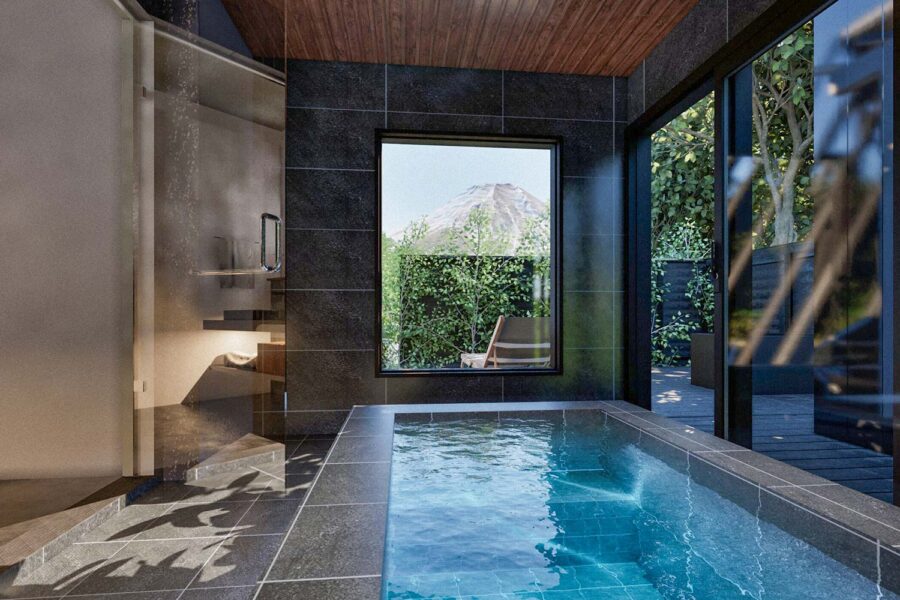 富士山を望む2棟のプライベートヴィラは、広々としたガーデンエリアにプライベートプールを備えています。