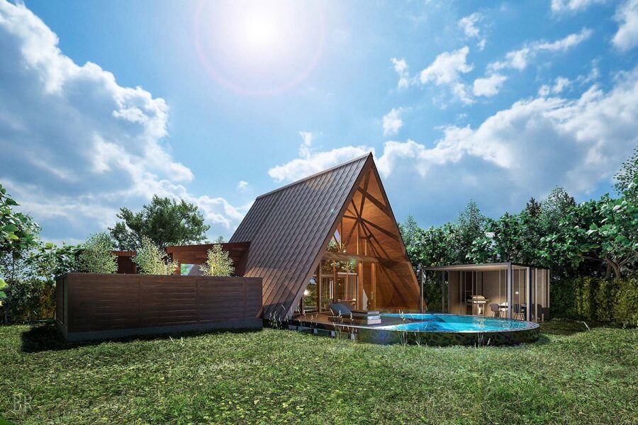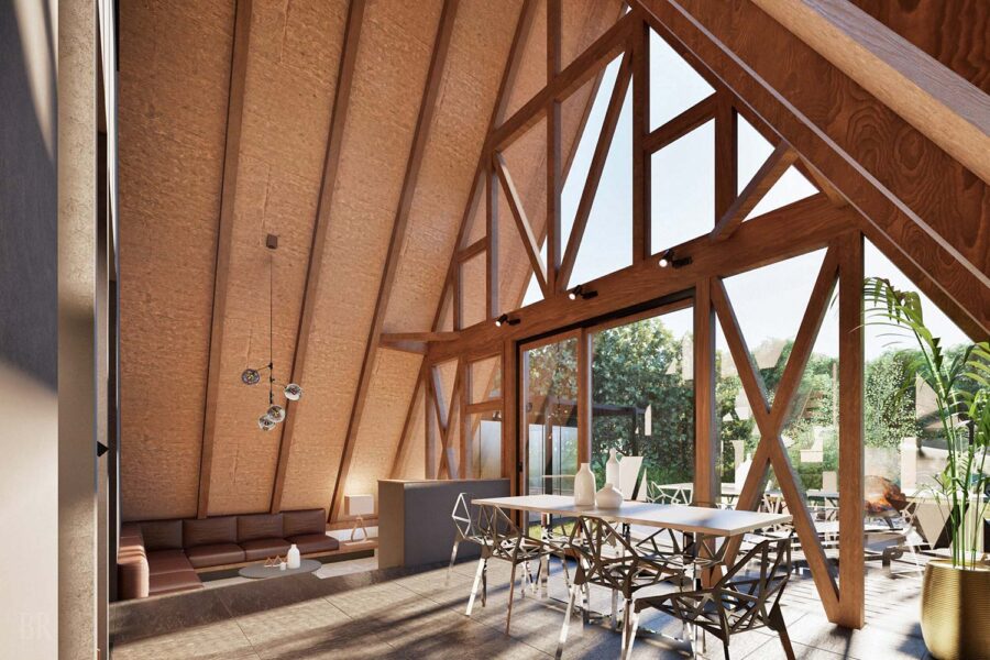 温かみのある平屋のヴィラは最大天井高5mと開放感たっぷり。