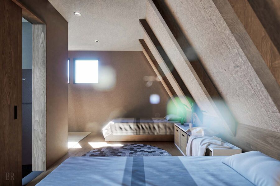 室内にはキッチンも備え、寝室が1階と2階にわかれているので、グループや2世帯での利用でも快適に過ごせるのが特徴。